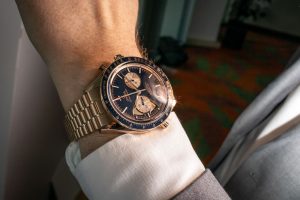 Created by grinding aventurine glass into a paste and applying it to the bezel surface with a Grand Feu enamel process, this striking material adds a touch of sparkling mystery to the watch on the wrist. Around back, Omega Replica Watches adds a sapphire display caseback to capture the complexity of its new in-house Calibre 1932 movement and mounts the watch on a Sedna gold variant of the famed Speedmaster “Nixon” bracelet.For the dial of the Speedmaster Chrono Chime, Omega extends the dark, moody aventurine enamel across the entire main dial surface. The CK 2998’s sharp alpha handset gives this a familiar vintage vibe, as do the applied rectangular indices, but the subdials and outer rehaut breathe new life into the Speedmaster layout.
